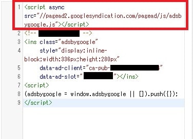 まずは、自分のブログに使用しているアドセンス広告の以下と同じJavaScriptの箇所を削除していきます。