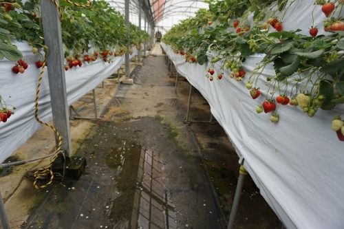高設栽培になっていて、真っ赤ないちごが沢山ぶら下がっています。