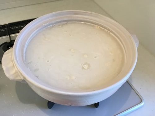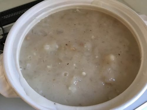 お水の1/5量のご飯、片栗粉、小麦粉などを入れ、弱火でコトコト約1時間炊きます。