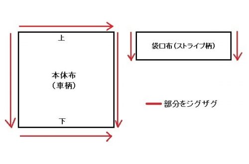 本体布は四方すべてにジグザグミシン、袋口布は両サイドにジグザグミシンをかけておきましょう。
