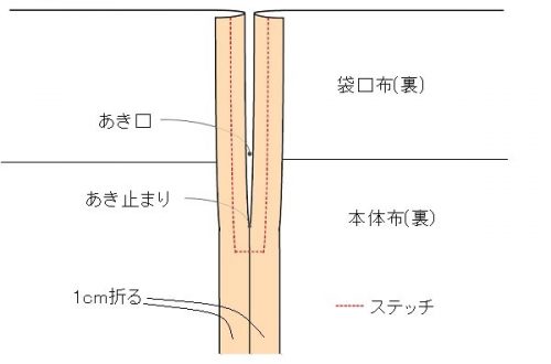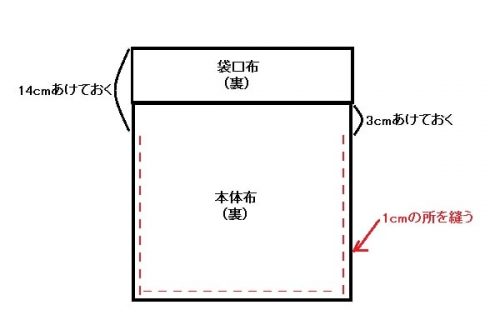 本体布の上3cm(袋口から測ると14cm)は縫わずに開けておきましょう。