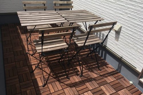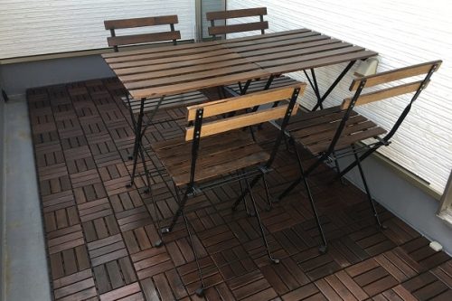 我が家のベランダは、床全体にIKEAのRUNNEN(ルッネン)を敷き詰めてウッドデッキ風にしています。