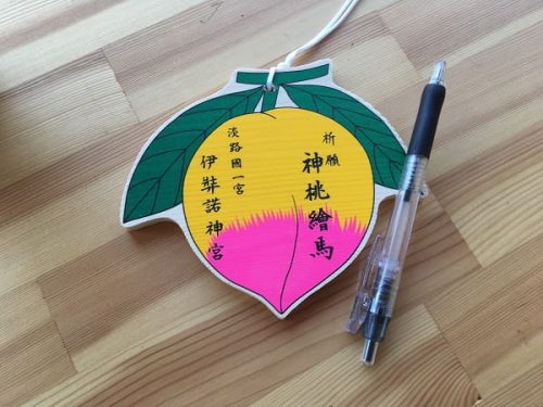 伊弉諾神宮の絵馬は、桃の実の形になっていて1つ500円。