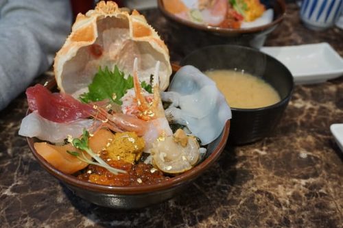 観光バスや観光客、地元の人も多く立ち寄る日本海さかな街で新鮮な海鮮丼を食べてきました。