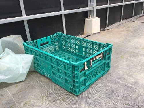 ハウス内は暑いので、コートなどはハウス隅に置かれたカゴへ。