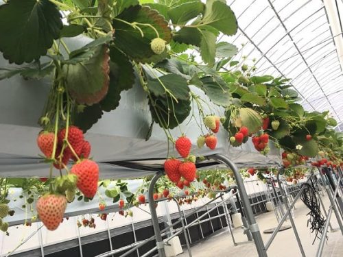 ハウス内は高設栽培でいちご狩りがしやすく、床にはマットが敷かれていてすごく清潔。